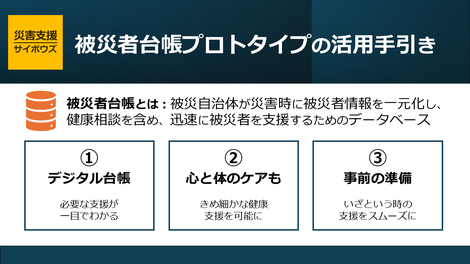 内閣府により2025年8月に発行された「被災者台帳の作成等に関する簡単手引き」をベースに被災者台帳のプロトタイプ(お試し版)を作成しました。そのプロトタイプの作成目的やアプリの主な機能をお伝えします。